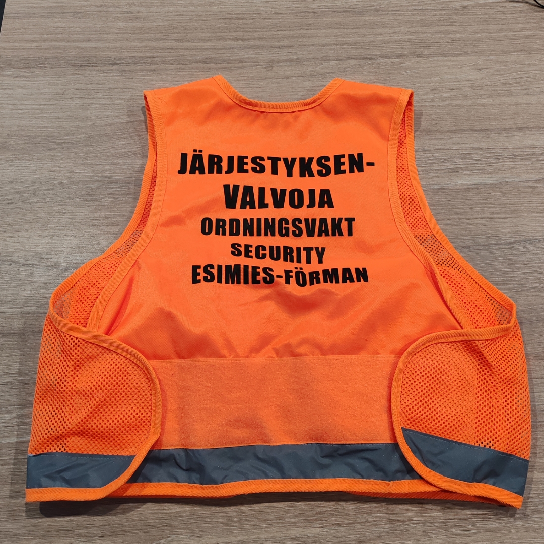 Oranssi järjestyksenvalvojan esimies liivi. Liivissä on rinnassa ja selässä tarrapaikat tunnuksille, sekä sopivasti taskuja, joihin saa hyvin mahtumaan tarvittavat välineet. Verkkokangasta kyljissä.