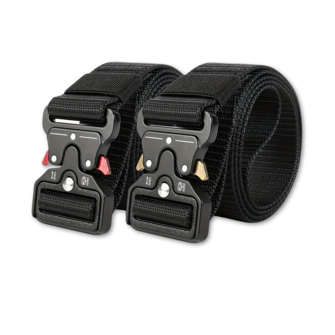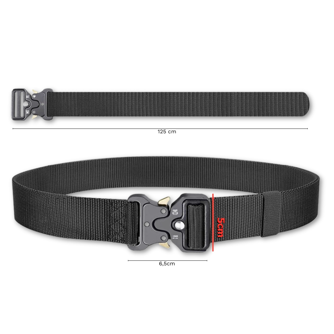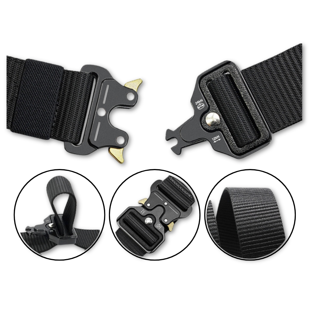 Musta varustevyö QuickRelease-soljella, joka varmistaa nopean kiinnityksen ja irrottamisen hätätilanteessa. Vyö on suunniteltu kestämään päivittäistä käyttöä ja erilaisia aktiviteetteja.